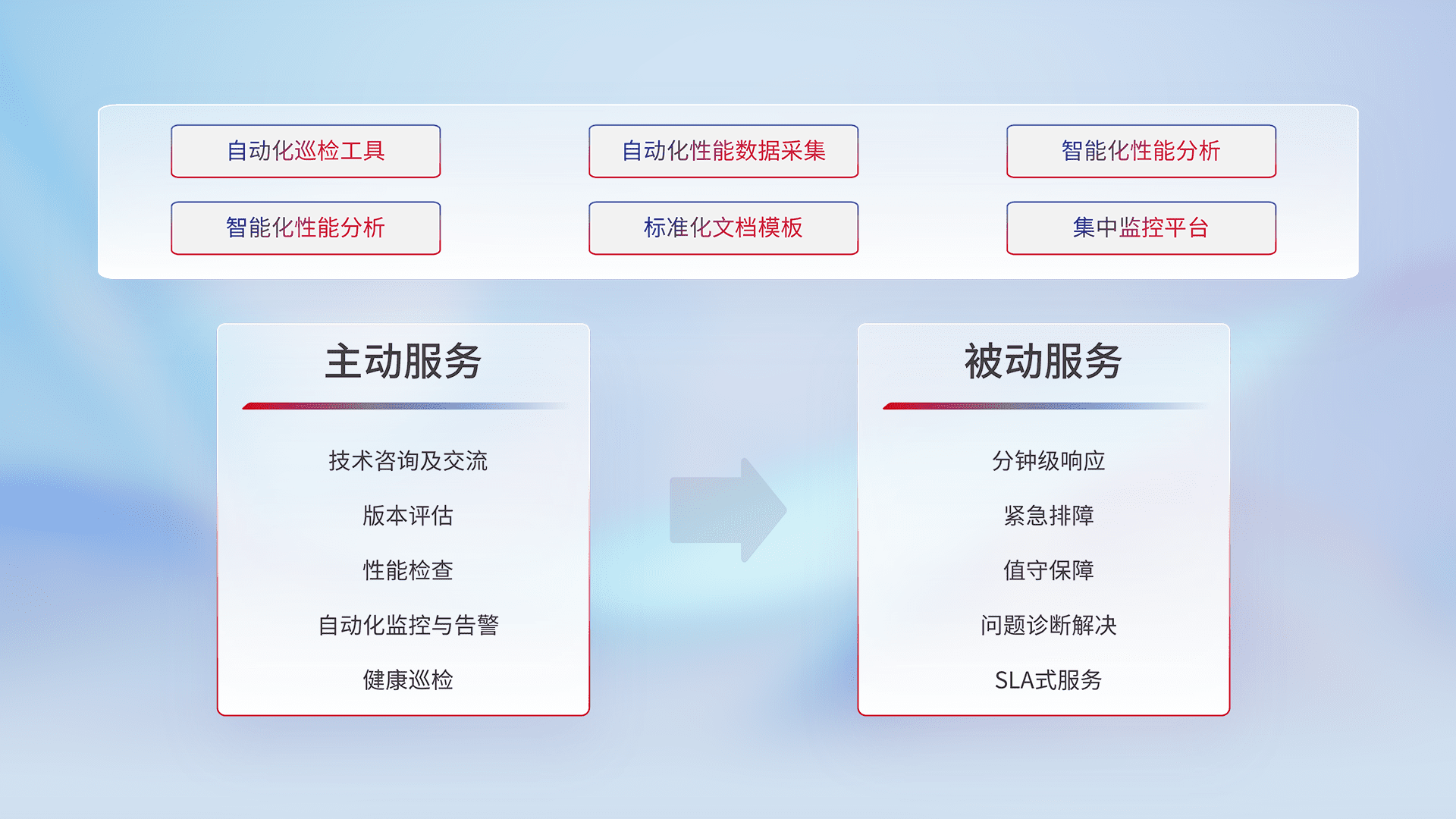 智能化工具和标准化文档,,保障服务质量,,提供主动服务(包含技术咨询、、、、版本评估、、、性能检查、、、、自动化监控与告警、、、、健康巡检)和被动服务包含(分钟级响应、、紧急排障、、、值守保障、、问题诊断解决、、、、SLA服务)。。。。